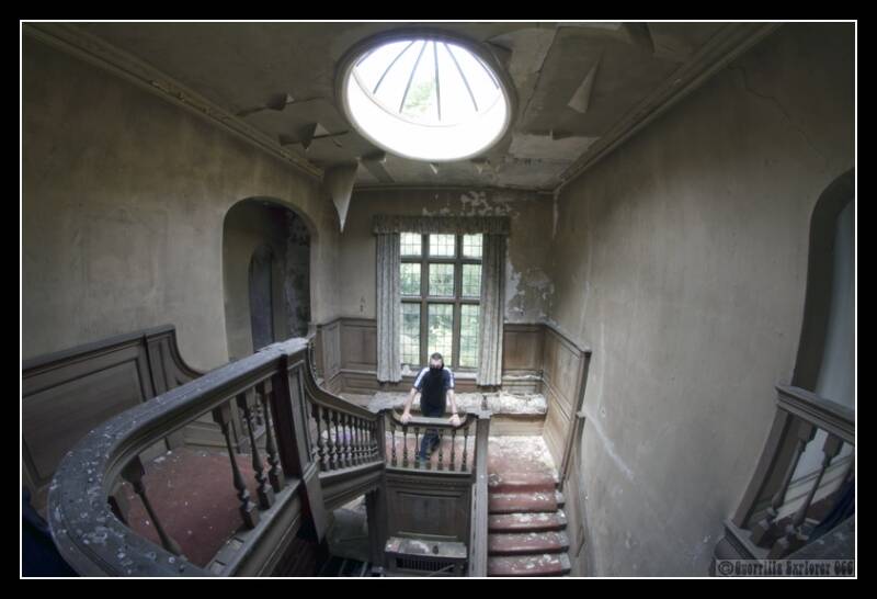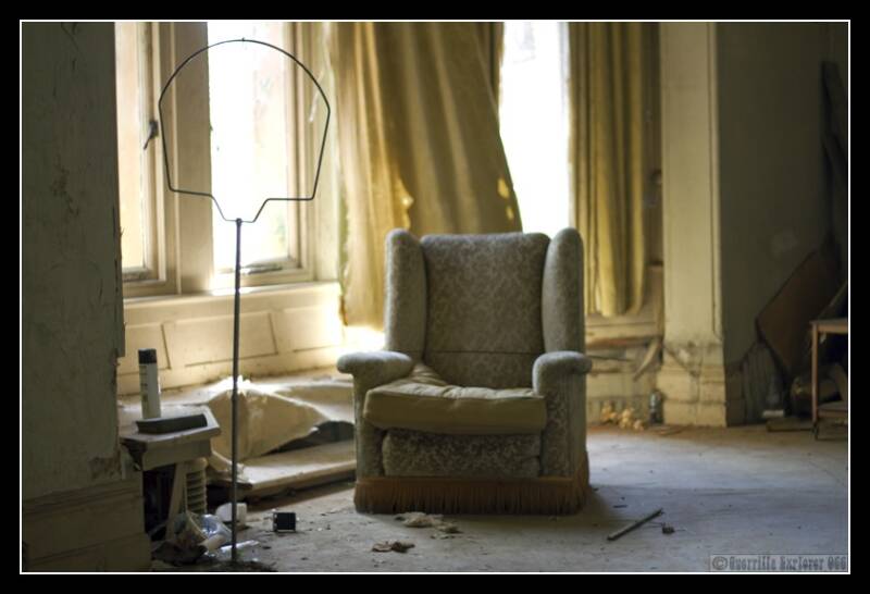 The next room was the complete opposite of the previous room, in that it was filled to the brim with all sorts of oddments. The remains of a drinks cabinet and numerous soft single seat chairs, gives the impression this was some sort of room for talking, drinking and smoking, setting the world to rights. The once impressive ceiling slowly falling into disrepair and beyond.