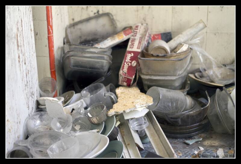 Next were the kitchens, still littered with crockery, food and cleaning products.