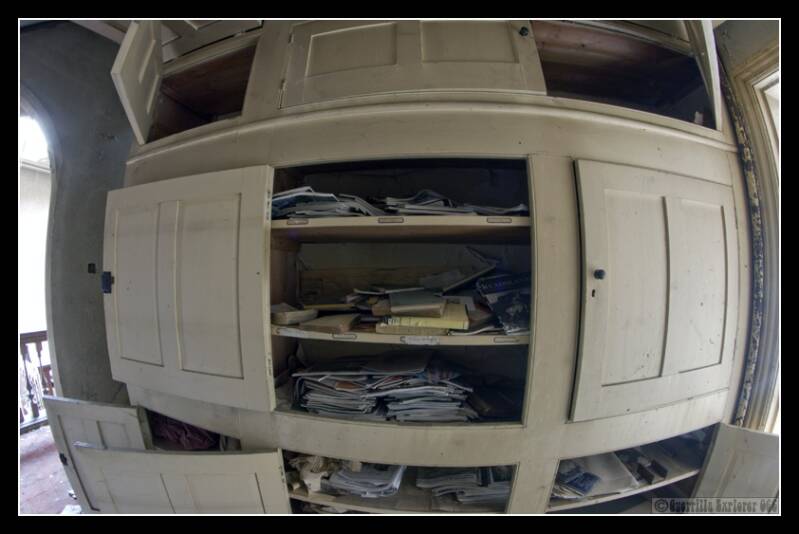 Walking to the back of the house on the first floor, a room with an open window and wasps nest nearby, due to the number of them hovering around the window. The floor was strewn with boxes and papers of all sorts. Bank cheques, newspapers, magazines, personal letters and documents, bedding. A wardrobe lay open to reveal more.