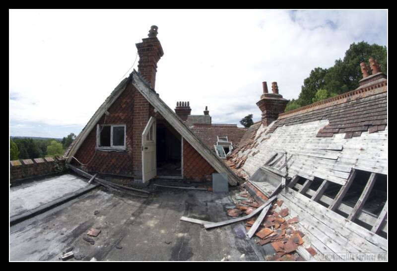 A room at the far side lead out onto a roof terrace, showing the poor state of the roof. The many fireplace chimneys poking out.
