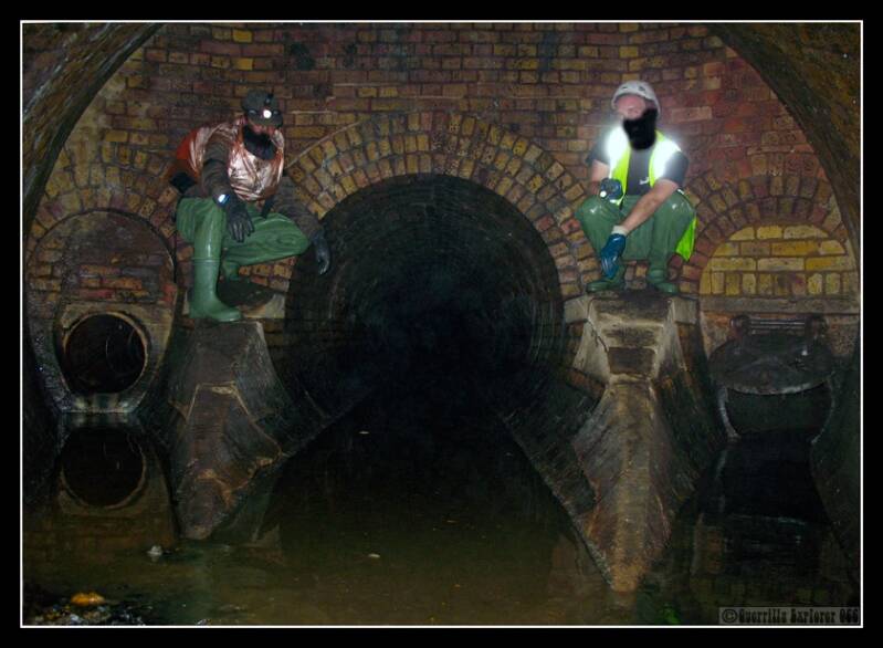 I'd chosen the target lid, as it was a nice old rusty one. The other lids in the area were all shiny new ones, we weren't sure we could open, and with commuters everywhere, it might look suspicious if we struggled. All dressed up in our credibility props, we headed across to the lid. Gringz dropped down first, and did a reccie. It was about 4'6-5ft high, and the water at knee height, but slow flowing. Having recently done the Paris Catas, I felt confident of doing it. The others concurred, and Kev dropped down, and myself quickly after.
