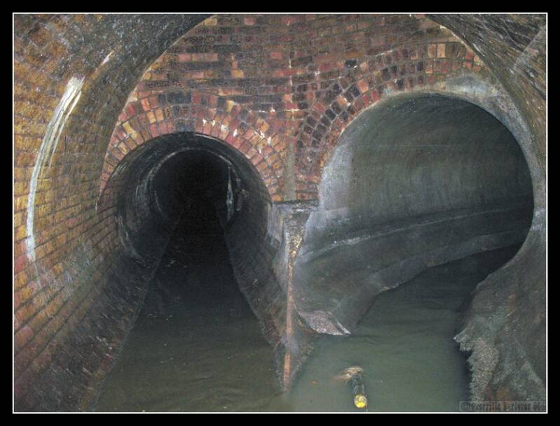 Kev stepped over the wooden barrier, and we were in deep water. It was threatening my knee. We all crossed and happily walked down the much larger pipe. It was probably only a 100m if that, and we came to the end for us in the Brook. On the other side was probably the Western Interceptor, running under the A4.
