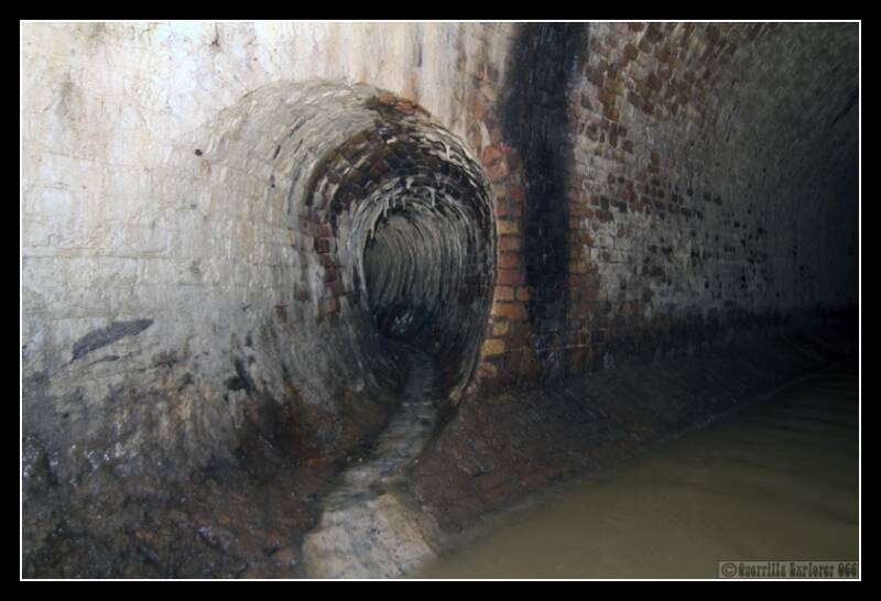 Not long after we started, we came across an interceptor junction, where the River Fleet gets sucked away the current flow off down to Beckton, and the whole process starts again with side sewers pumping in the fresh. Speedio with Gringz behind him. The interceptor on the right.