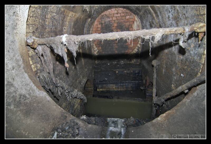 Not far around the corner from the above is this huge pipe that leads into the pipe we were exploring. Gringz looks down at masses of small insects climbing over the nastyness. Just where he was looking were steps down into the thick sludge.