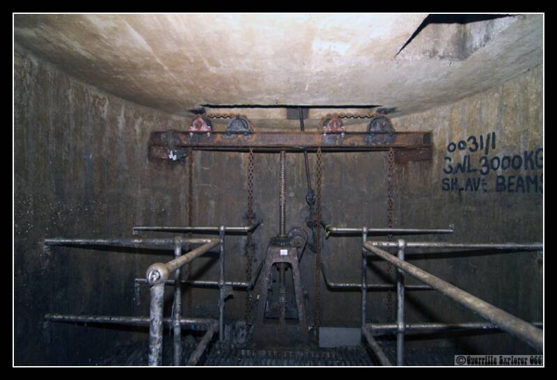 Due to the rather large lump in the gardens nearby, and having a map, I knew there was a large pipe nearby. I vaguely recalled an old lid i'd seen nearby, and on finding it, I popped down for a looksie. The shaft was went down around 10m, which would put it within the realms of a Storm Drain. On walking to the top gantry from the lid, a large mechanism was in place to lift a solid cover at the bottom of the shaft.