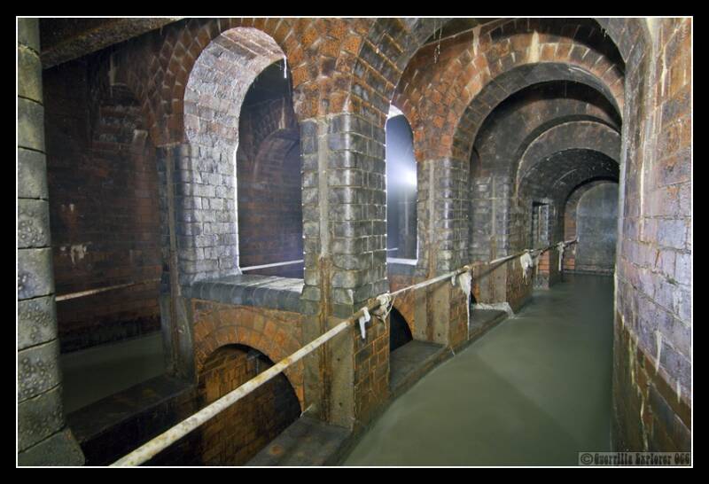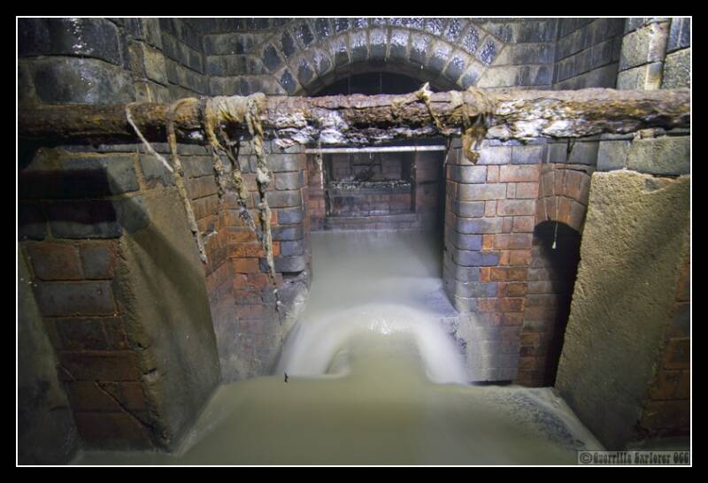 The lower middle chamber with two lower overflow weirs, dumping the two sewers either side of the camera into the interceptor below. If the sewer levels were higher, they would dump over the walls either side of the camera.