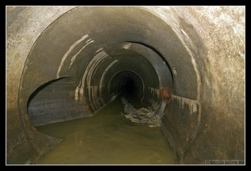 Residues sits in the mainline tunnel continuation. On the right is the interceptor from the West crossing the Counters creek, on the left is the channel for the interceptor to continue east..The metal grill above Residues is an access point for workers from the surface. (This is point 2 on the Map)