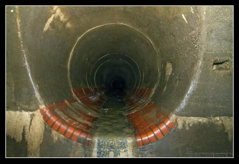 Returning to the lid we exited from last time, we slipped out of the darkened weekday evening, and descended once more into the mire. The air had a mild air of putridness to it, and the dark, deep, slow moving stream filled around us, as we climbed in. I listened carefully, and couldn't hear the sound of an interceptor, even though we were very close according to the map. Eventually we reached the interceptor, and found out why we hadn't heard anything. This shot is looking out of the interceptor chamber back up the mainline tunnel to our access point.