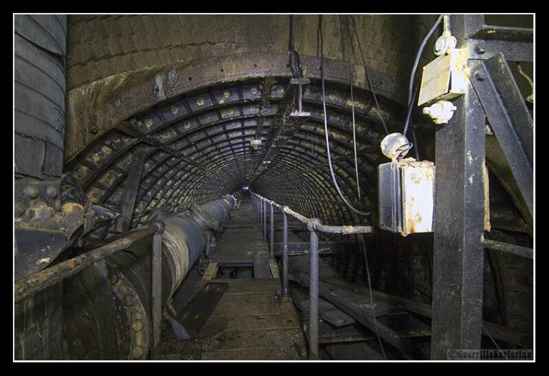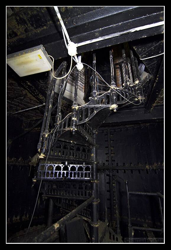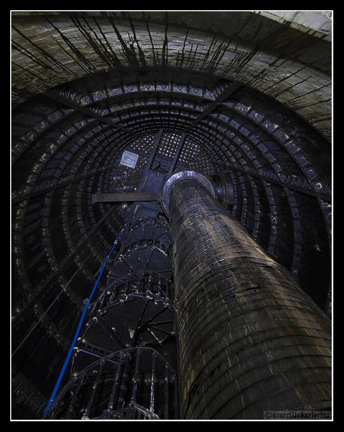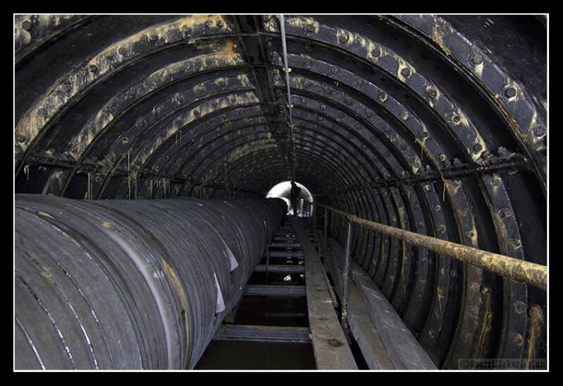 The other end of the tunnel, looking up. One large pipe, rather than 4 separate ones. A lovely iron spiral staircase rises to the surface, as apposed to the ladders on the North bank.