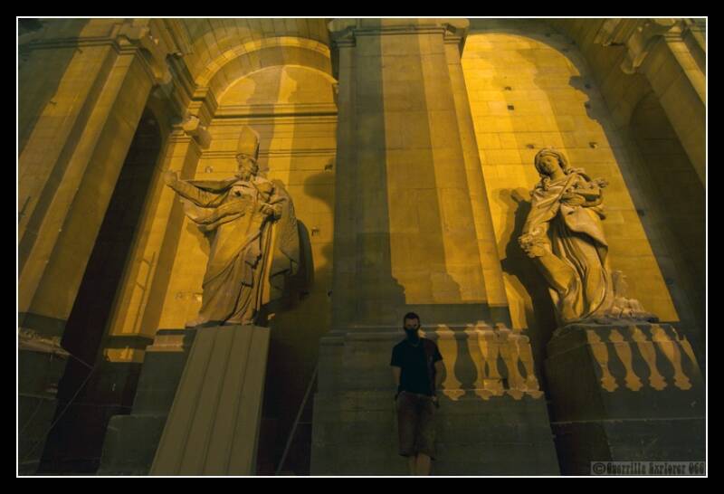 Claire Elise and myself dutilfully followed Marc as he swapped from trams to metro trains to flying unicorns. OK, maybe not the latter. Eventually we ended up at the target, which turned out to be a large church. But it was too early, so we dived into a cool looking bar/restaurant and grabbed a table. The restaurant area was smallish, and had an angled long mirror around below the top of the room. I was able to ogle a lovely fulsome breasted young female across the room with complete discretion. Only the drool forming on the side of my mouth being a giveaway clue. Beer & burgers gulfed down, and some rather nice chocolate dessert, and we were nicely stuffed. The Church from the front during the day.