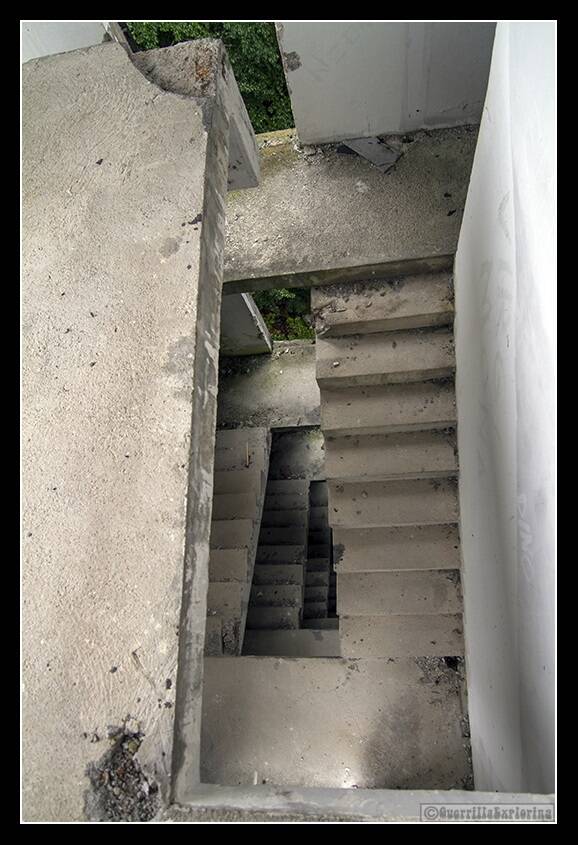 The inside of the ski jump tower was all bare, a small room sat behind the jump presumably where the jumpers waited to be called. i have done some crazy things during my time, but launching myself down here on some planks is something that would never have happened! The wooden building at the end of the tree line near the bottom of the jump, is the judges building. It was smashed to bits and of little interest to photograph. It was used by the UN troops when trying to keep the Bosnians and Srpska armies apart.