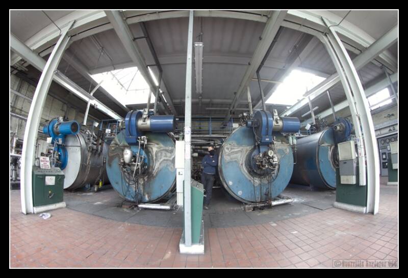 However despite circling the building twice and checking every possibility, I couldn't find a way in. Obviously security had been watching the posting on forum sites, and sealed it up. We did find a way into the boiler house though, and that was pretty awesome. The 4 blue boilers each had a control panel sat next to them.