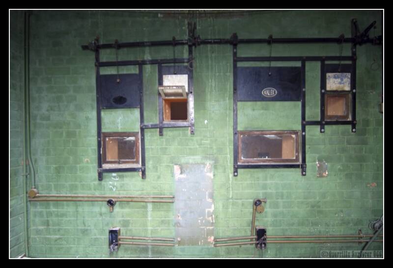 It was then onto finding a way into the main block that sits in the middle of the site. We found a small building that faces the boiler house that had central swivel windows. These have a pivot through the middle and come out to horizontal position. They're a huge pain and painful to get through. This one was smaller than normal, and after a couple of preambles, I decided I wasn't going to get in there. A look around showed an open sort of hoist doorway on the first floor, and after some messing about, TheSpaniard got up there only to find it was just a single room with no way out. TheSpaniard then walked carefully along a precarious glass roof to get onto the roofs of the building. I went back down to get my camera bag. As I did so a tough looking security guard walked about 10m away from me. I carefully tried to hide behind a foot high set of flowery weeds. Pathetic I know, but I was also wearing dark clothes in a shadowy area. I think if he'd have looked closer he would have spotted me, but he didn't. I was trapped in this area, so as soon as he was out of sight, I ran across to some windows and watched him through the glass. He stood to the side of the boiler house for around 5 minutes, as if waiting for someone to walk about inside. Satisfied there was no one in there, he carried on with his route. When clear I joined TheSpaniard on the roof. Here we found the old projection room. A sickly light green colour. The holes in the wall where a projector would have pointed, showed a large hall inside the building.