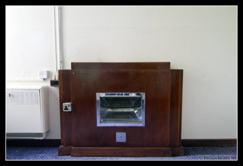 A canteen serving area lay off to one side. Walking around the corridors, we found some doors open into the corridor. They led into a chapel, judging by the confession booth, a Catholic one. Being someone who despises the Catholic Church for it's vile policies over the centuries, I held back from defiling the place. Instead I sat where the priest would sit to here people's sins.