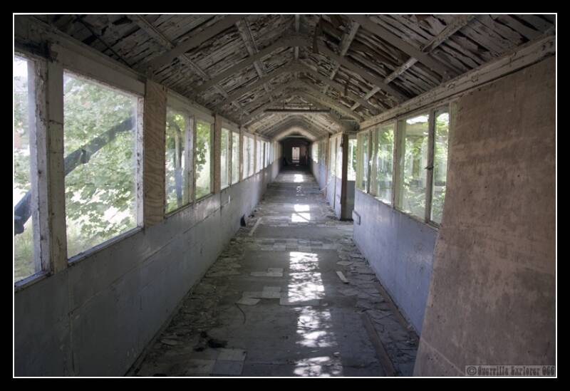 We walked down a wooded path on the side of the hospital, and then along the main road until we found a suitable fence to hop over. We came out near a Airing Court, where patients would take in the air.
