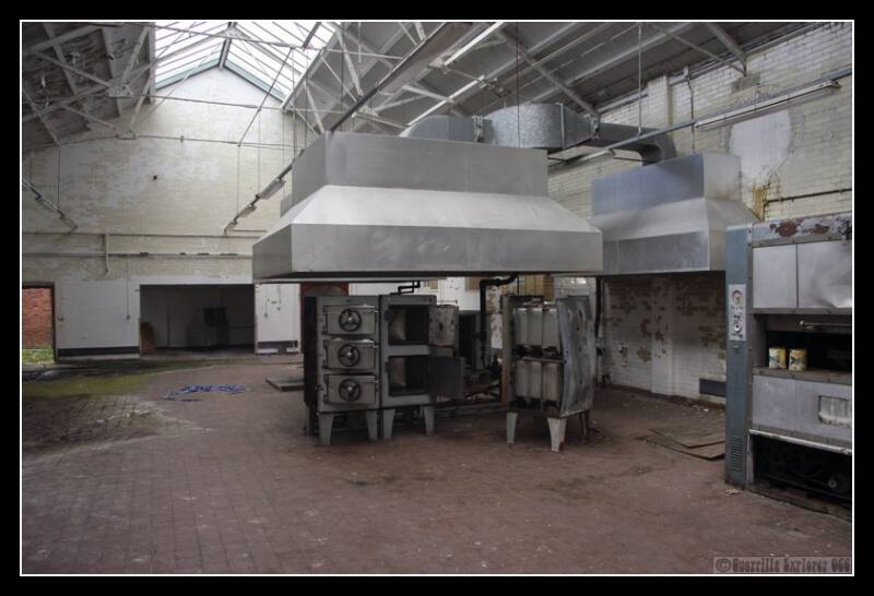 And the end of this corridor, we turned right into Lister House. It was made up of small office rooms lacking anything of interest. As we came back out into the corridor, we were faced with a breeze block wall built to stop people progressing. Luckily someone had left a handy chair next to it, and we climbed over. We ended up in the huge Kitchen area. Some ovens still remained, but most equipment had been removed.