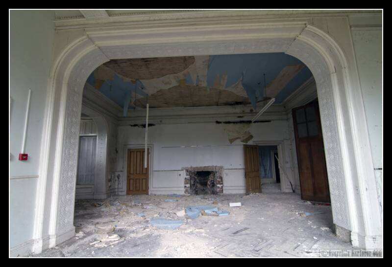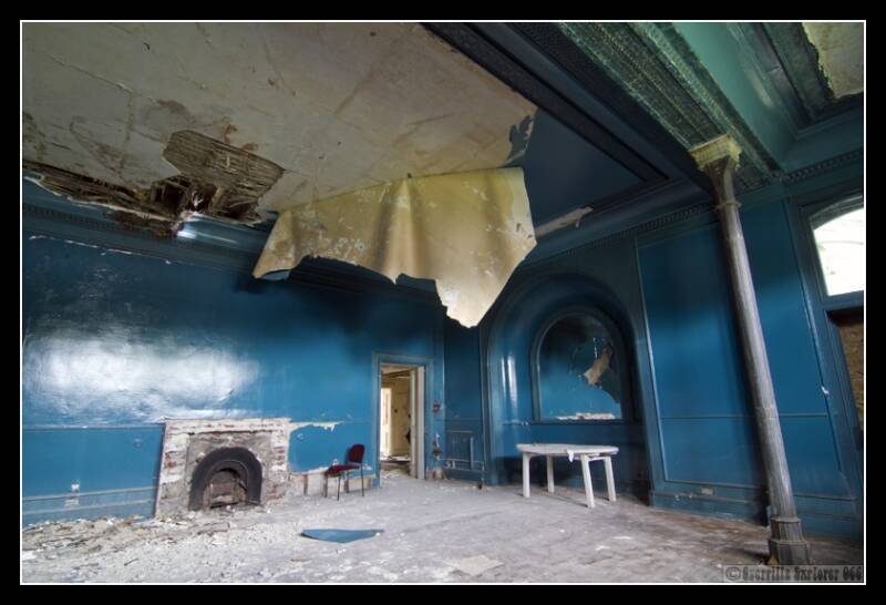 The room to the right of this one was bedecked in a wonderful deep navy blue, with a proud pillar doing it's upmost to keep the roof up. However in the middle of the back wall, you can clearly see where the ceiling has given way, with some poor soul having possibly fallen through or to the arms.