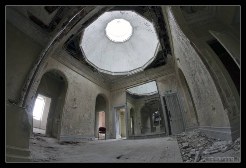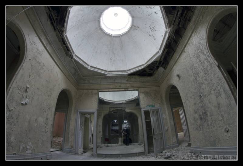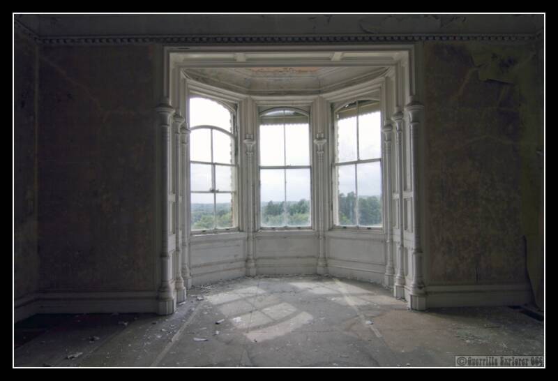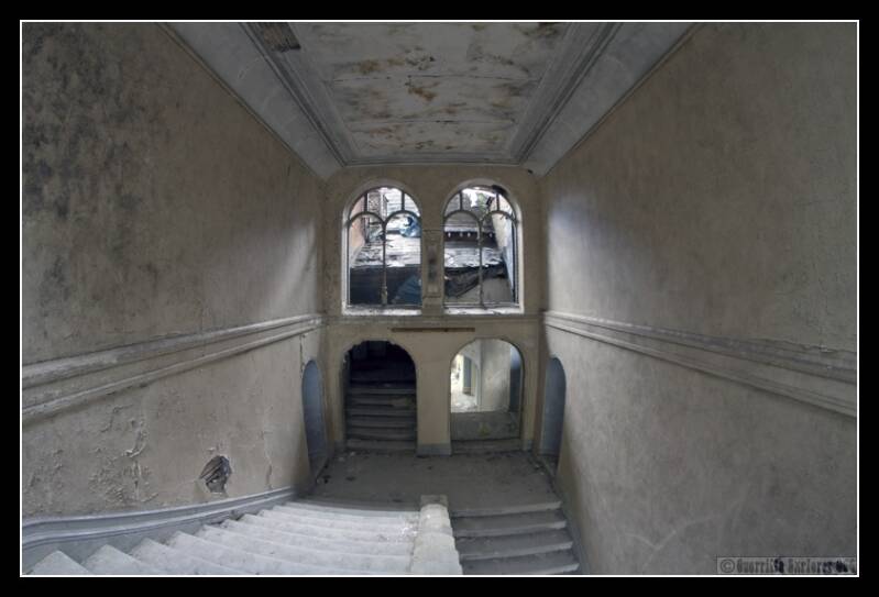 A basement revealed nothing but black walls, used as some sort of disco maybe. I then walked out to the original front entrance to the house, a grand affair with lots of glass and white woodwork. Now slowly being reclaimed by natures stealthy tendrils. I found Viv here, here large domed fisheye getting an outing. We caught up, and then continued our snapping.