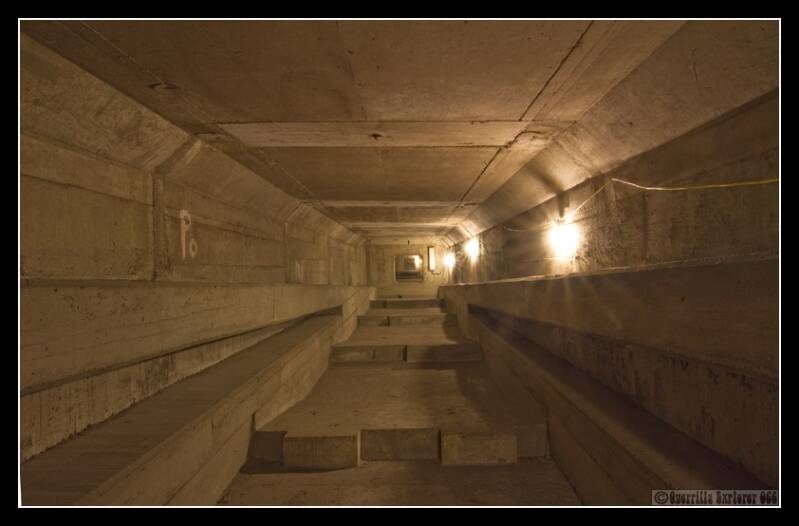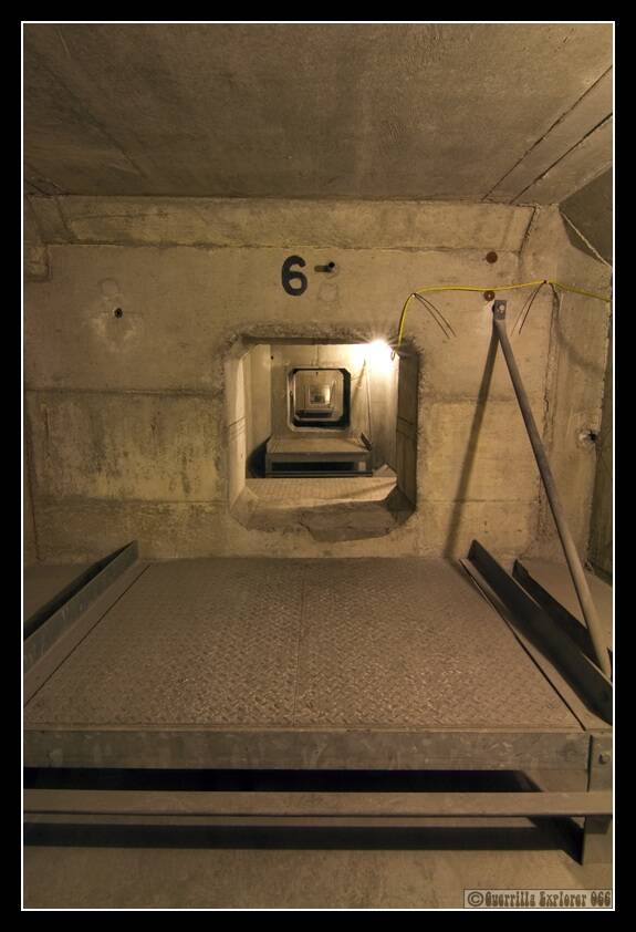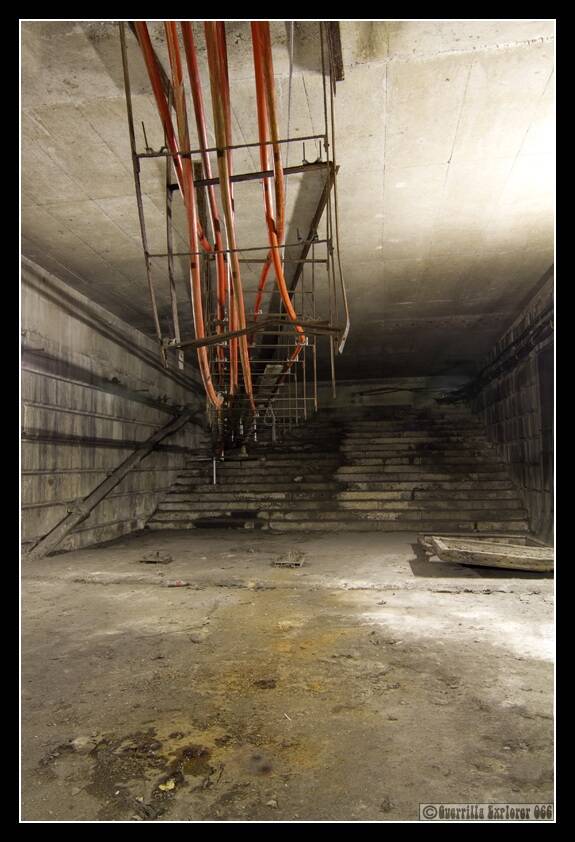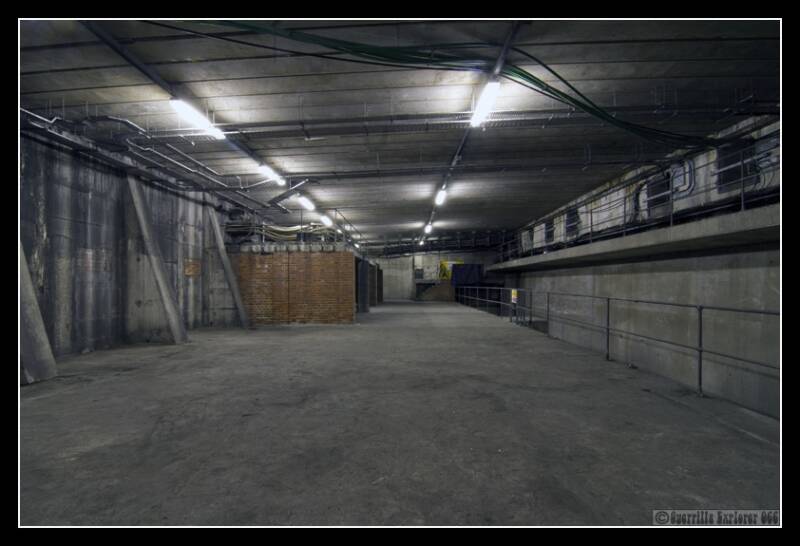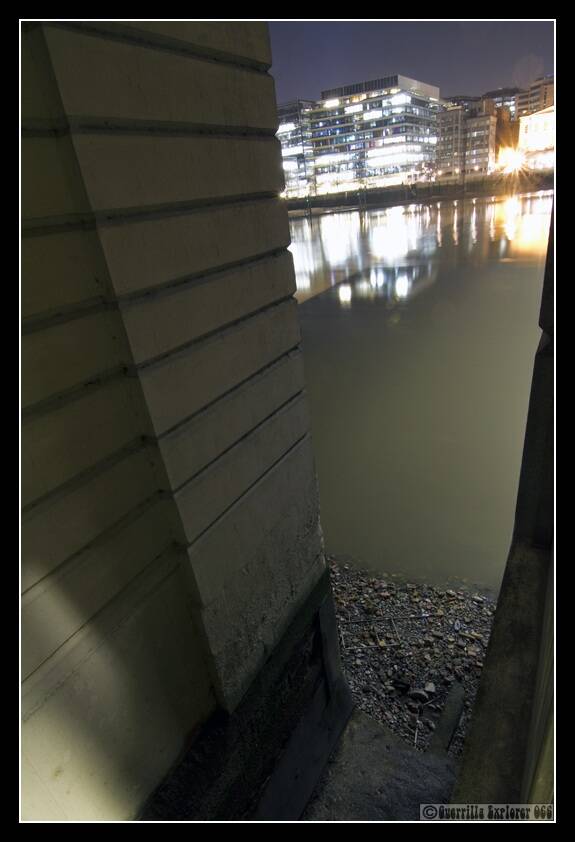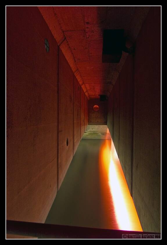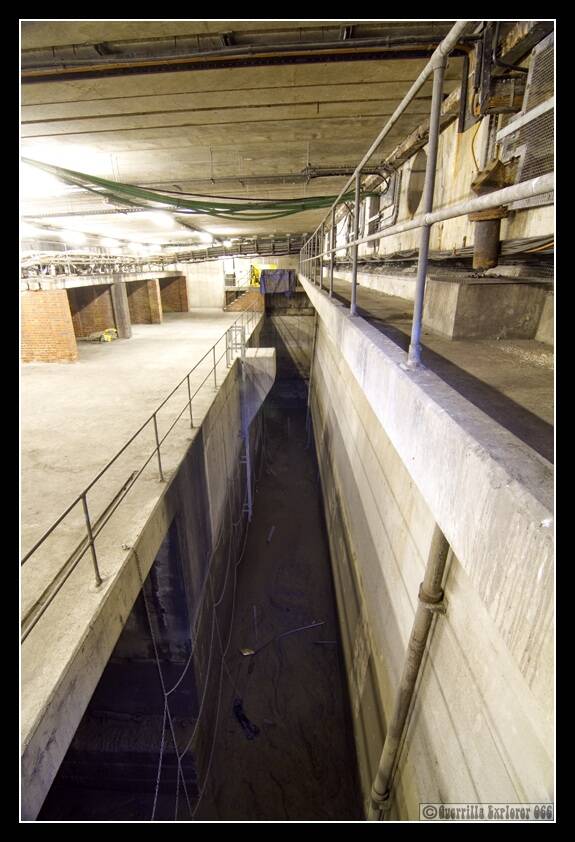 This is the large concrete room mentioned above. The square holes up on the right lead to the sections and compartments. Over the rail in the gap is the Thames. However, although tidal, it's mostly silt.