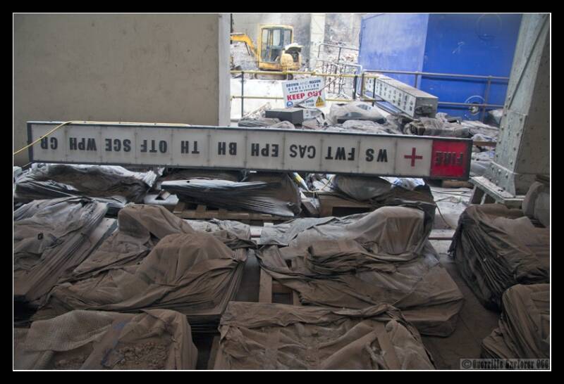 Down amongst the rubble was a collection of old lights and pieces that were to be saved from the station, including a warning indicator board.