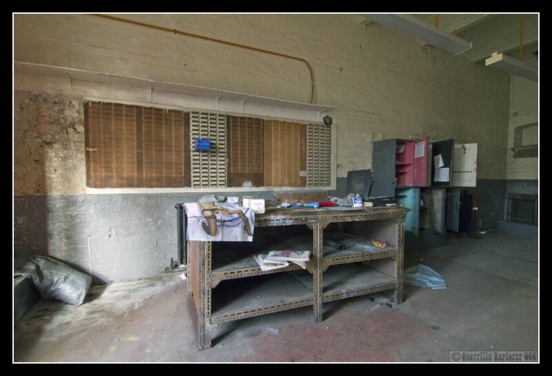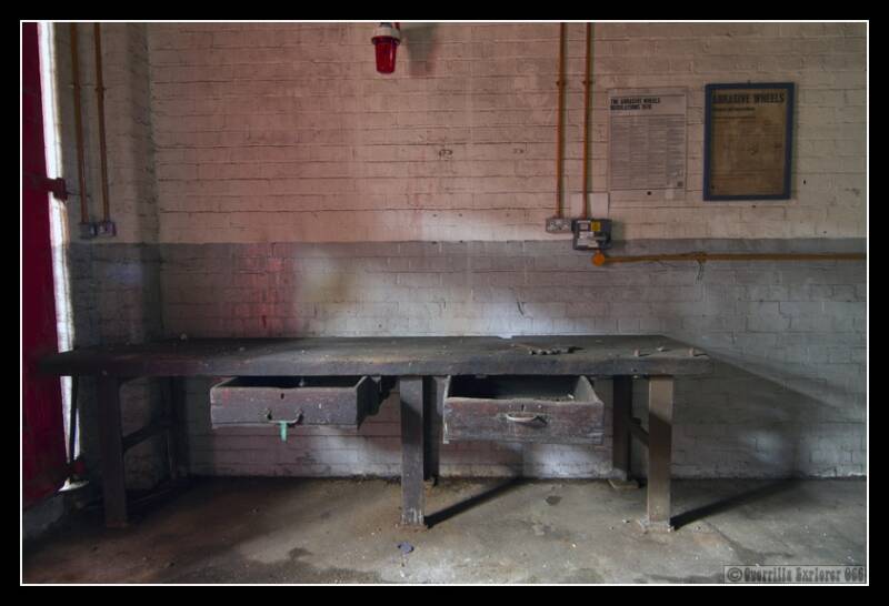 Inside one of the workshop rooms, the drawers and desk still had very large spanners lying about.