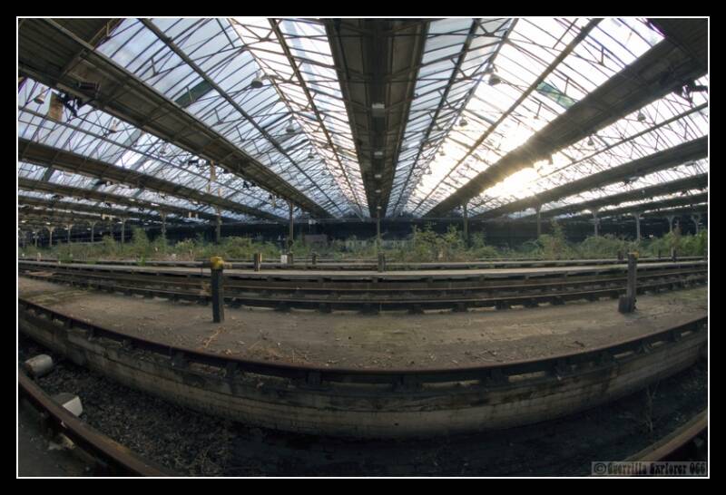 Signs from the roof indicating the different tracks. The far end of the depot's open exit/entrance, now blocked by a palisade fence.