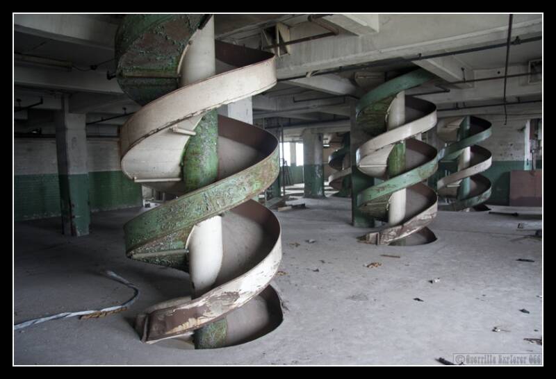 A few floors down, and we came across the numerous helter skelters that spiralled from floor to floor, carrying sacks of flour.