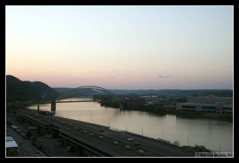 A gorgeous view of the Pittsburgh skyline, and the point where the Monongahela and Allegheny River merge to form the Ohio River, which flows left on the picture below.