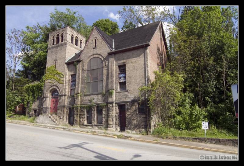 The first baptist church, sat abandoned on the hill into the centre of town.