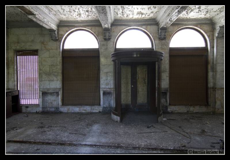 Inside the 2nd National Bank, there was little left behind. A safe on the wall, and some desks. The entire back wall of the upper floors was missing, and one could look down to overgrown vegetation below.