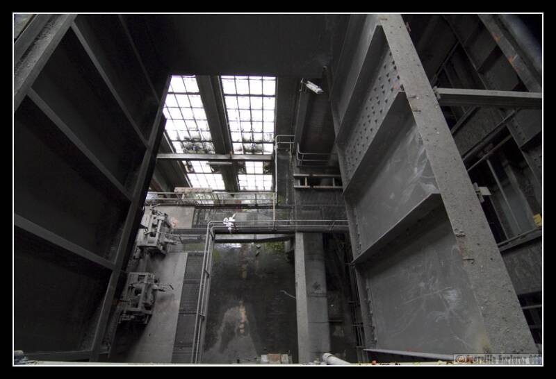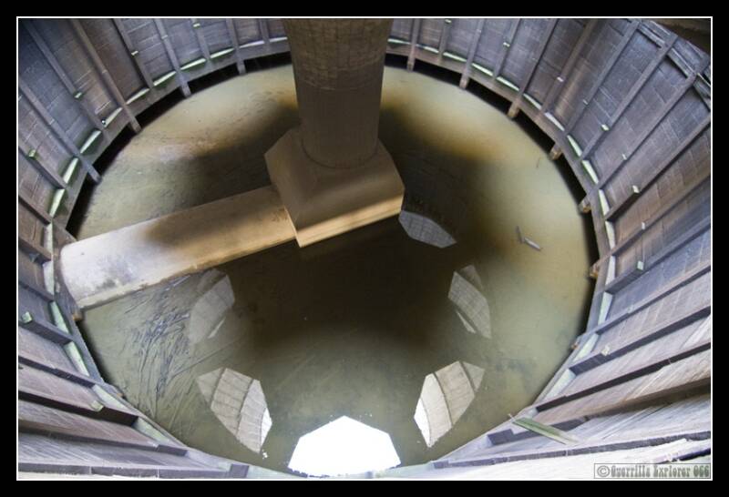 Looking out the window from a window near the conveyor belts, a large cooling chimney sits. I'd seen numerous shots from inside the tower, so headed off to get to it. It required a sneaky crossing of a bridge that was secured. But not secured very well.