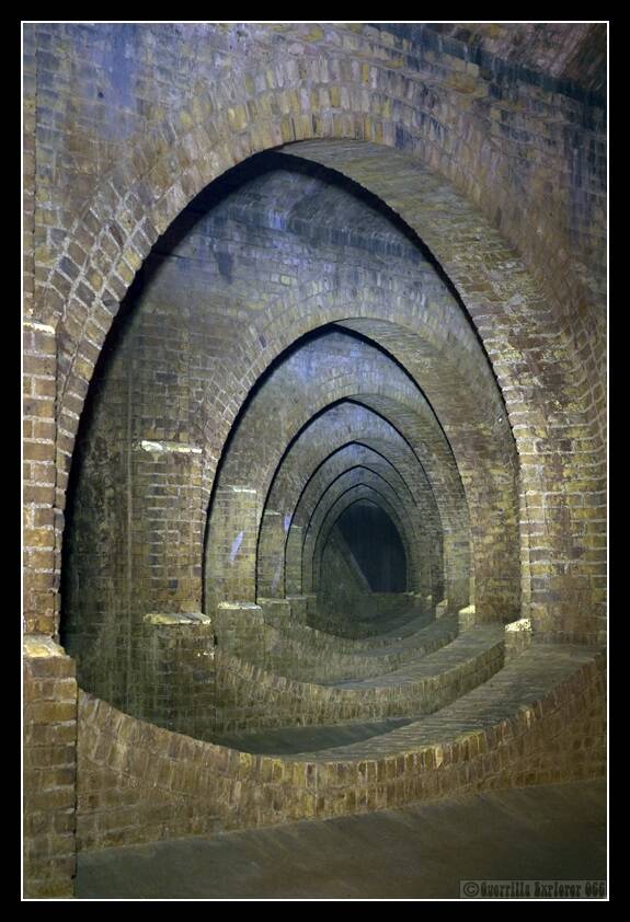 All done, it was time to head up the steps and out into the darkness of the empty park above. The different colours at the top of the steps and at the top of the arches show the upper limit of the water in here. Maintained by the overflow pipes mentioned above.