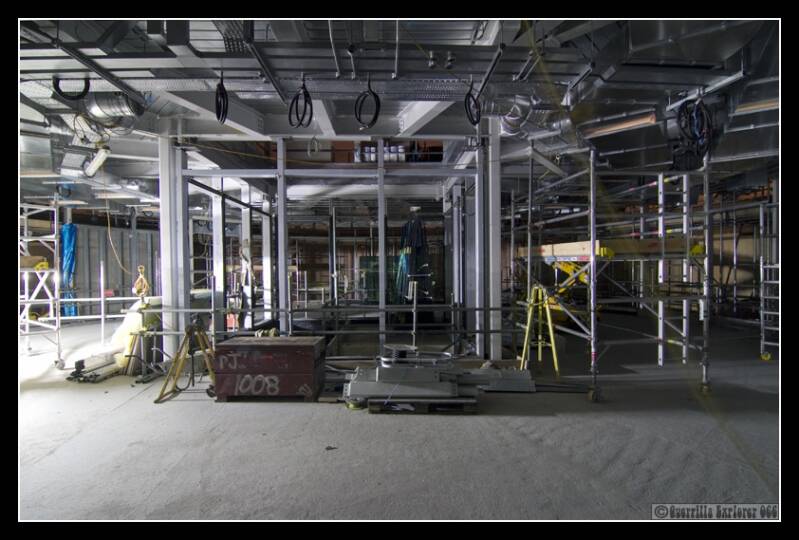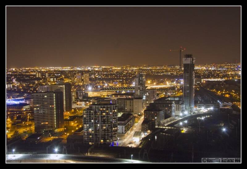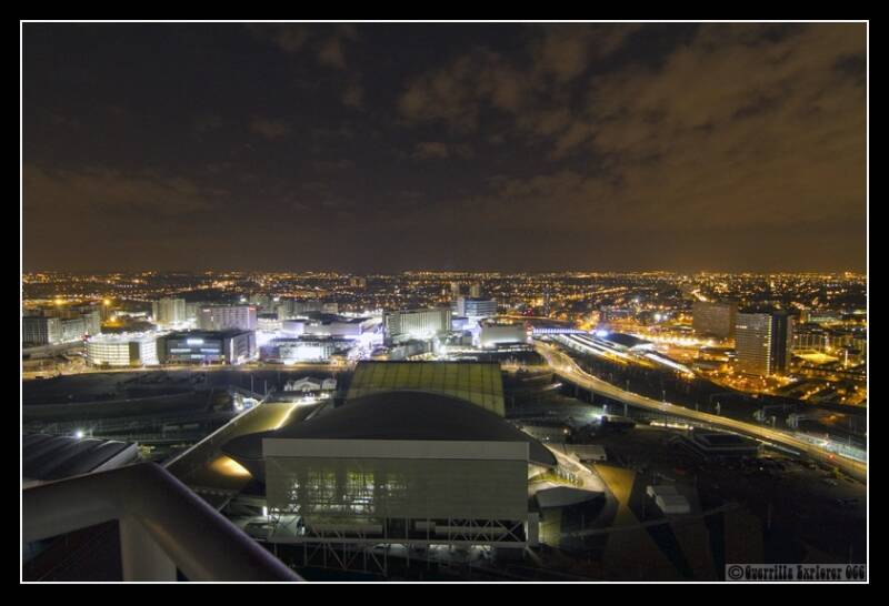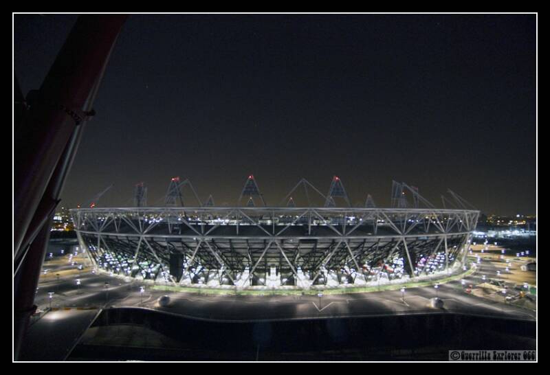 Fast forward a week later, and the BBC proudly showed footage of Royal Marines whizzing up and down the Thames in preparation for the games. A few nervous emails flew back and forth. Thinking of the worst, I gave my netbook and main hard drive to a friend, and then met up with GE077 at the nearby Westfield Centre. We had worked out access in advance, and waited for a gap between the 'stealth' security cars that endlessly circle the site. When it came we walked briskly to the access point, GE077 a few metres ahead of me, so there would be no delay going over. Some people were walking up the other side of the road by the access point, so I stopped and played pukey drunk, with GE077 asking if I was going to be ok. The people ignored us and walked by, when out of site, GE077 walked off and hopped in. I quickly followed behind. We dropped off into the site, and quickly ran for cover behind a tool hut. Out of site of the cameras. Our hearts pumping blood through our bodies as fast as it could, we sat waiting for all hell to break loose. Lights to come on, security cars to roar across with lights blazing, SAS to pop up out of unseen holes in the ground.