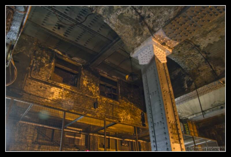 I was mainly interested in the old posters left behind from another era, so while Kev got busy downstairs, I got busy upstairs. This could have been just a walk through area, or a ticket office or a backroom office. However between the regular brick wall and the A/C fans, a passage leads off to the underpass (via an alarmed door). The underpass was the original entrance to the station.