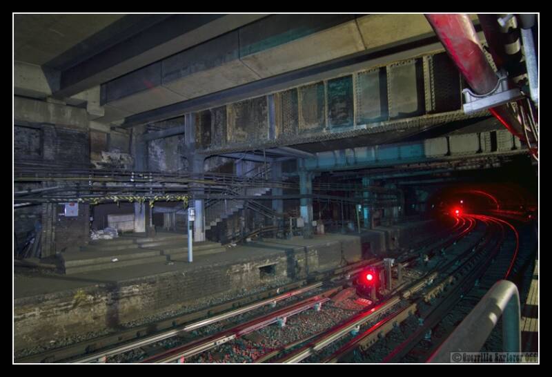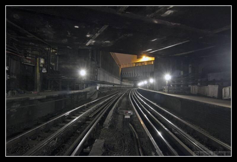 Through the door at the top of the leftside stairs above, was the option to go right and across the tracks to the rightside, forward and up a ladder to the surface (once upon a time) or left and up a passageway.