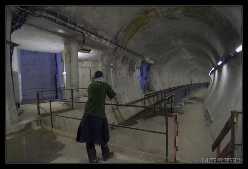 Finally, we reached rock bottom. The main chamber of the tunnel extension had been completed some time ago, but work was still going on building all the side exits. Various supports are in place to hold recently made cement and control its form.