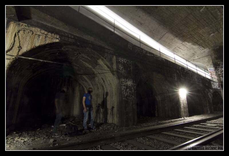The empty raccord tunnel, and eery silence down here. I was, probably like the others, wary of a train suddenly hurtling down here. However, none ever came. Our only hope of avoiding being discovered was the alcoves, as seen on the left wall before the first light bulb.