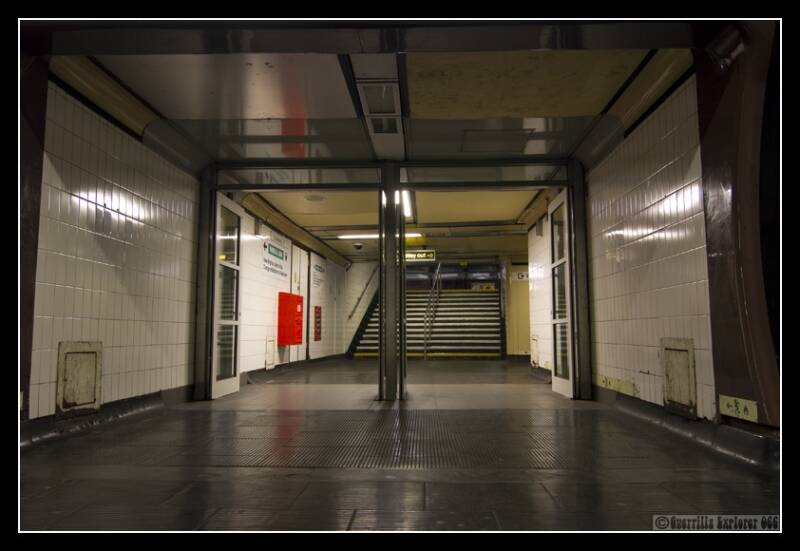 It seemed a fair way, but eventually, we came upon our first station. It confirmed we were following the route I'd expected, and we sat and watched the station for a while, to be aware of sounds or even sight of someone who should be there. Not being convinced there was an imminent threat, we climbed up onto the platform and shifted down, conscious we were on camera most of the way. As we reached the surface access exit points, it got brighter.