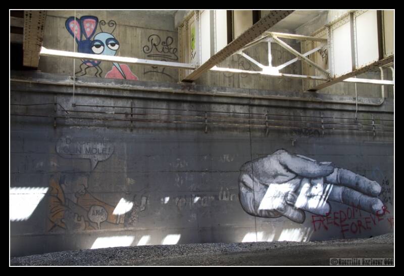 The sorry state of Freedom's original artwork that graced the tunnel. Cheaply painted over. The piece says 'Drop the gun mole', a reference to the people that lived here. The mole people. The giant hand is a newer piece. Between the two is a mostly rubbed out piece that proclaimed 'There is no way like the American way.' The original full mural from EarthMagnified