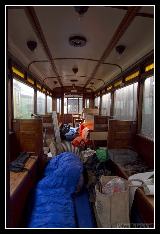 After creeping into the site in the early hours, we checked around for a tram we could enter. This one was open, and we found space to crash out. GE066 in the foreground, OllieGT bedded down on his luxury mattress beyond me, and Residues camped out at the front of the tram.