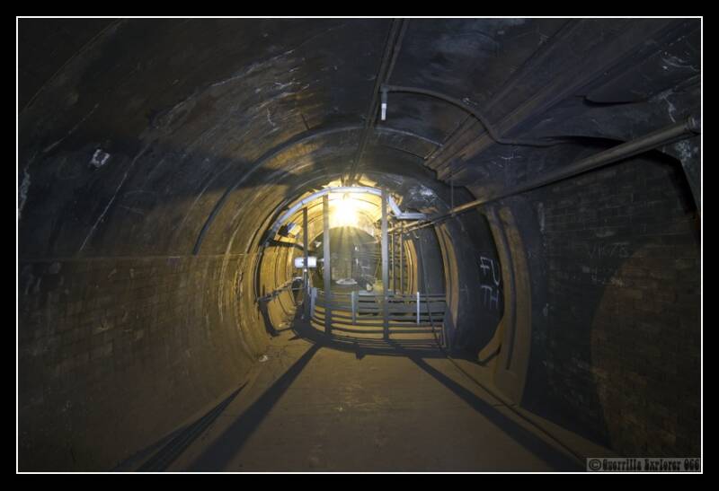 Dropping down the ladder in the above shot, and as mentioned above, a short tunnel leads out from the bottom of the vent shaft, and has grills that lead on to the tracks. The tunnel ends on the right where it's dark. The brief colourful ellipse, is the colours from the Northern Line platform. When a train stops in the station, looking through the right vent will mean looking into the trains cab of a Southbound train. It's believed that the tunnel was a test bore for a Deep Level Station that was proposed to be built here during WWII.