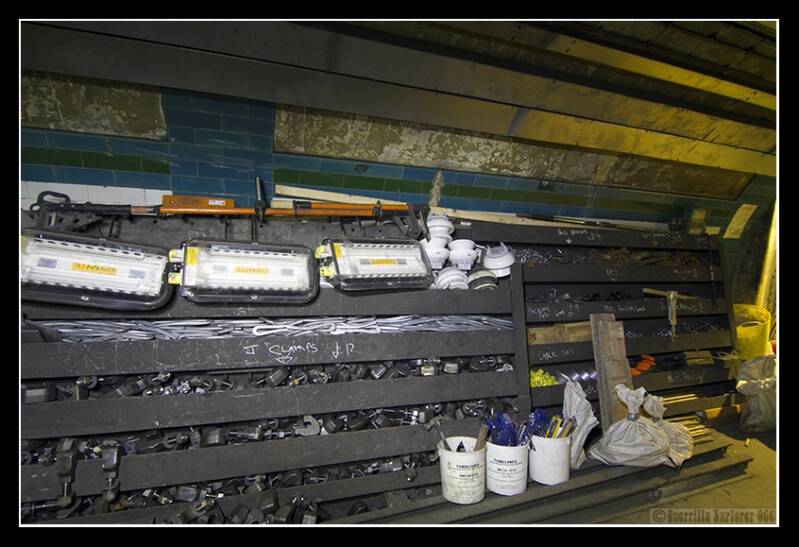 The passageway twisted after it passed over the Westbound tracks, and was full down one side with tools and components for track workers. In the foreground a wheelie bin full of crowbars.