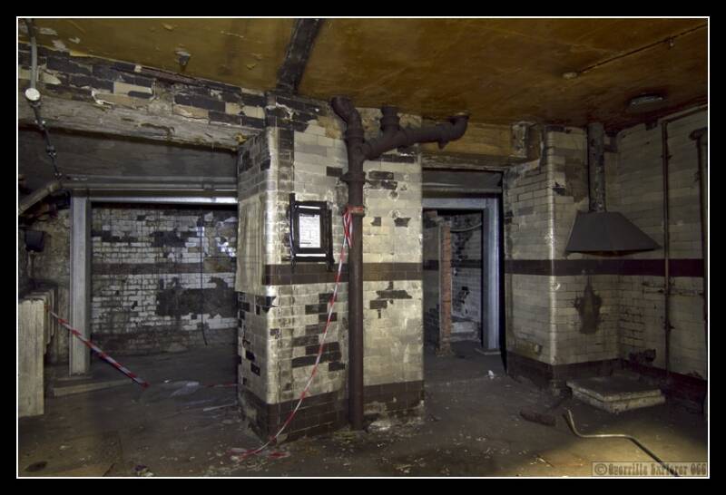 Outside the building on the main street, we could hear members of the public passing by, buses breaking and accelerating. It put ones nerves on edge. Every time a train pulled in below, the gush of air would rattle the shutters, making us jump. Stairs lead down to the basement level of the station.