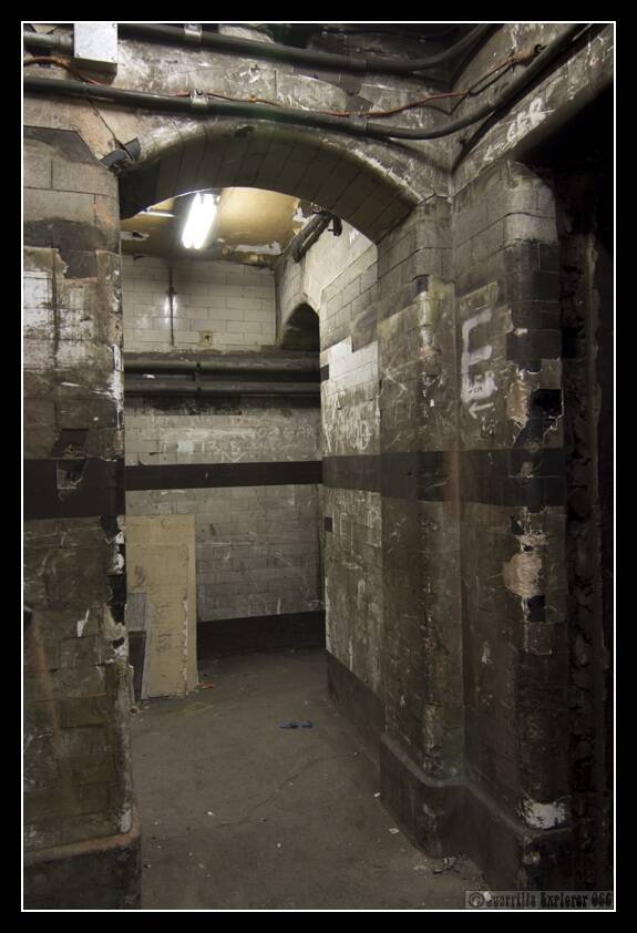 180 degrees from the shot above, the steps lead down to a passage. Likely these once lead to stairs down to the platforms. Just out of shot around the corner is a new-ish looking wall with a locked modern door in it.