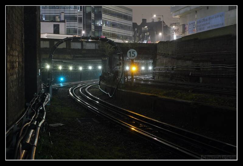 Looking out West, the tracks in the centre of the pic. The workers party can be seen in the centre top third of the picture, heading towards Ravenscourt Park Tube station, lit up just ahead of them.