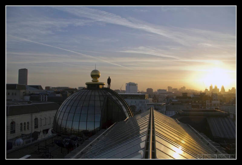 Being an avid fan of targeting rooftops in popular central locations in London, it was a delight to find out that getting to the rooftop of this building next to Piccadilly Circus was so straight forward. Apart from a glance from a curious taxi driver, I was up and on the top of the scaff trouble free. However getting further onto the roof wasn't so easy. I ended up somewhat precariously scaling the shingle roof to get to the next level. From here it was easy to get around. A number of ladders left about, stairs and caged ladders.