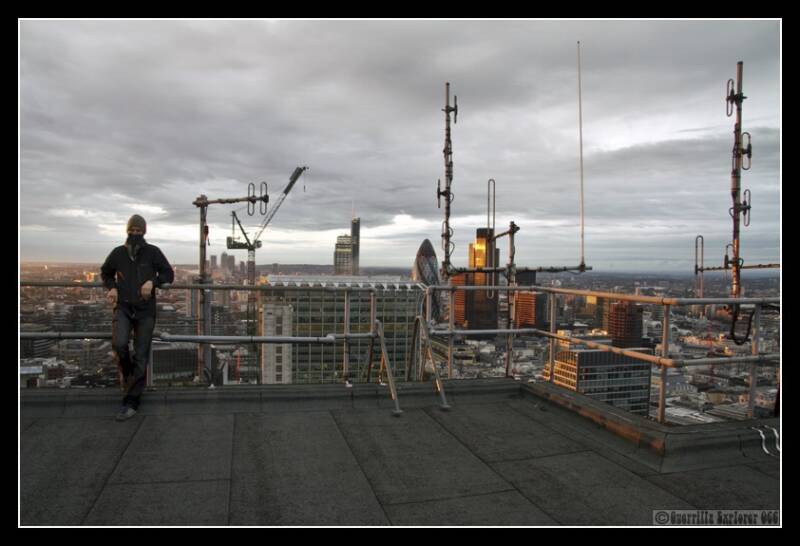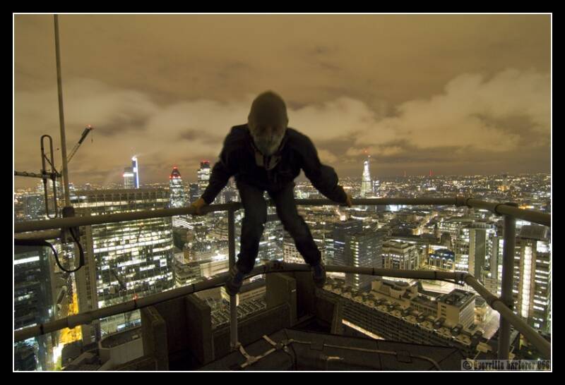 A few explorers had already done Lauderdale tower a while ago, and Gringo had intimated he wanted to do it and had found a way sometime later. After doing that, he, as well as I, were keen to finish the trio. We looked at the other two, and the signs were not great. They were much better protected. However I had a bold idea as to how to do it, and so it was that we returned with Kev to give it a go. Gringo did the tricky bits, and then Kev and I cleaned up so to speak. We then all ascended to the top. Here we came to the next obstacle. A locked door to the roof section proved no trouble to my co-explorer's skills, however, the next locked door to the very top did. I carefully slipped out and onto the roof of one of the penthouses, and looked around. Before I knew it I was showing the others a way up, and we were on the very top. Not having done this at Lauderdale, it was a satisfying feeling. Cromwell reflected in an office block on London Wall.