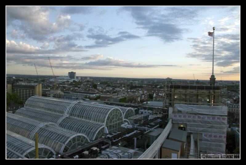 Britain's favourite hate comic's cage sits within the beautiful art deco Barkers centre, some may call this irony. This shot is from the middle plinth that stick out over Kensington High St. In the distance the looming dome roof of Earls Court.