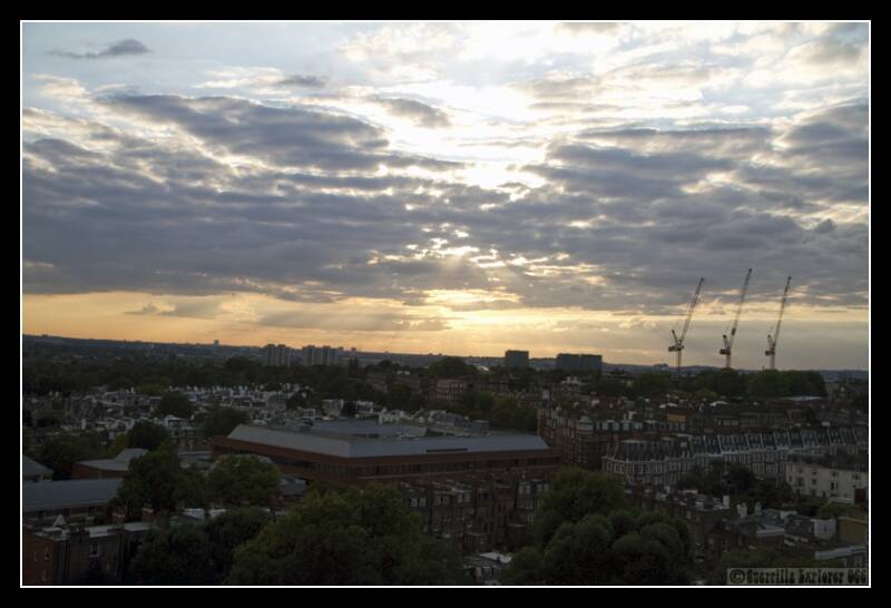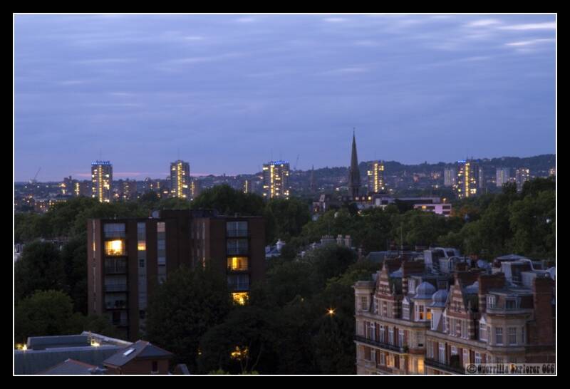 Holland Park. I like the way the central stairwells are lit up in the tower blocks. You can also see the shaping of Notting Hill on the right, as the building climb the slope. I'd love to time travel back, and see London with it's natural unobstructed views.