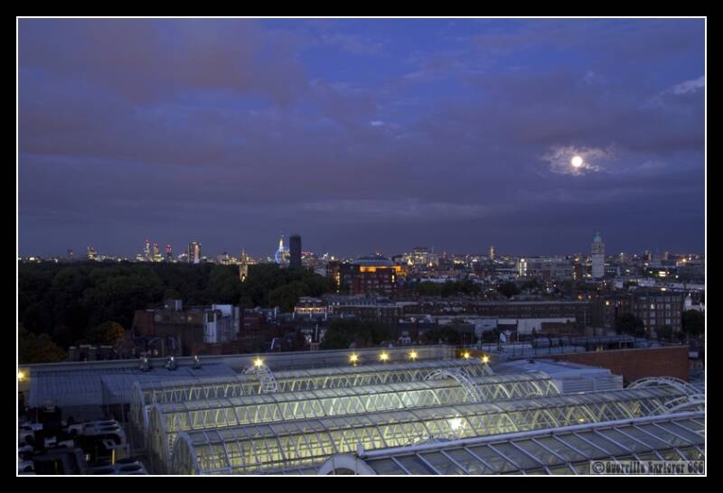 The various bits of Central and East London lit up, with the moon giving an eerie glow in the clouds. I did think about climbing over the arched roofs, but a) I'd have to have cut through the bird netting, and b) I'd be rather too visible.